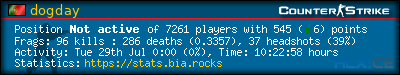 | 1 | dogday | 0d 02:19:46h | 2025-07-29 00:26:38 | 47 | 101 | 0.47 | 17 | 0.36 | 0 | 12.2% |