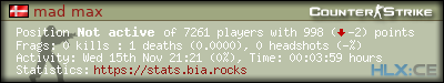 | 1 | mad max | 0d 00:02:49h | 2023-11-15 21:29:58 | 0 | 1 | 0.00 | 0 | - | 0 | 14.3% |